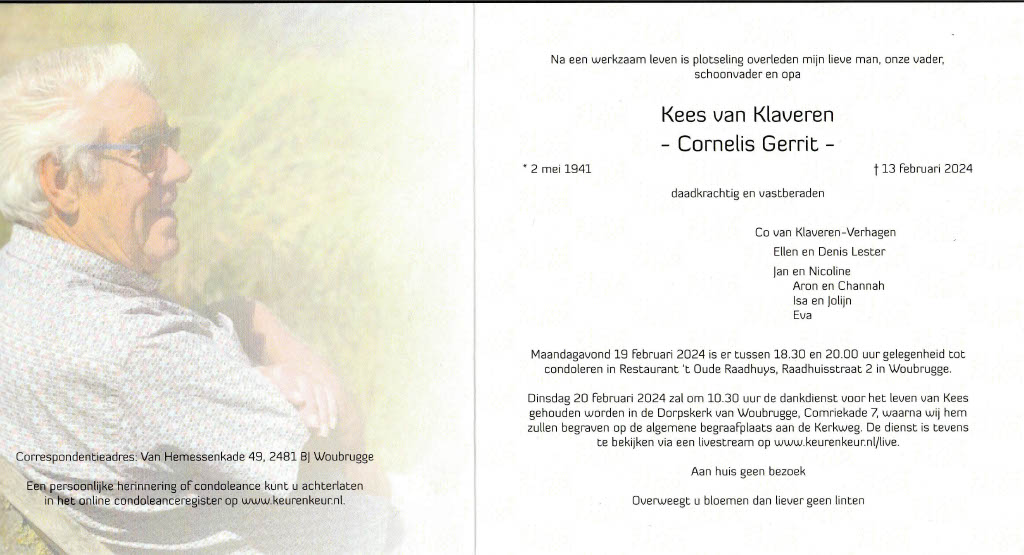 De dankdienst voor het leven van Kees vindt plaats op dinsdag 20 februari om 10.30 uur in de Dorpskerk van Woubrugge, Comriekade 7. Aansluitend vind de begrafenis plaats op de Algemene Begraafplaats aan de Kerkweg te Woubrugge.