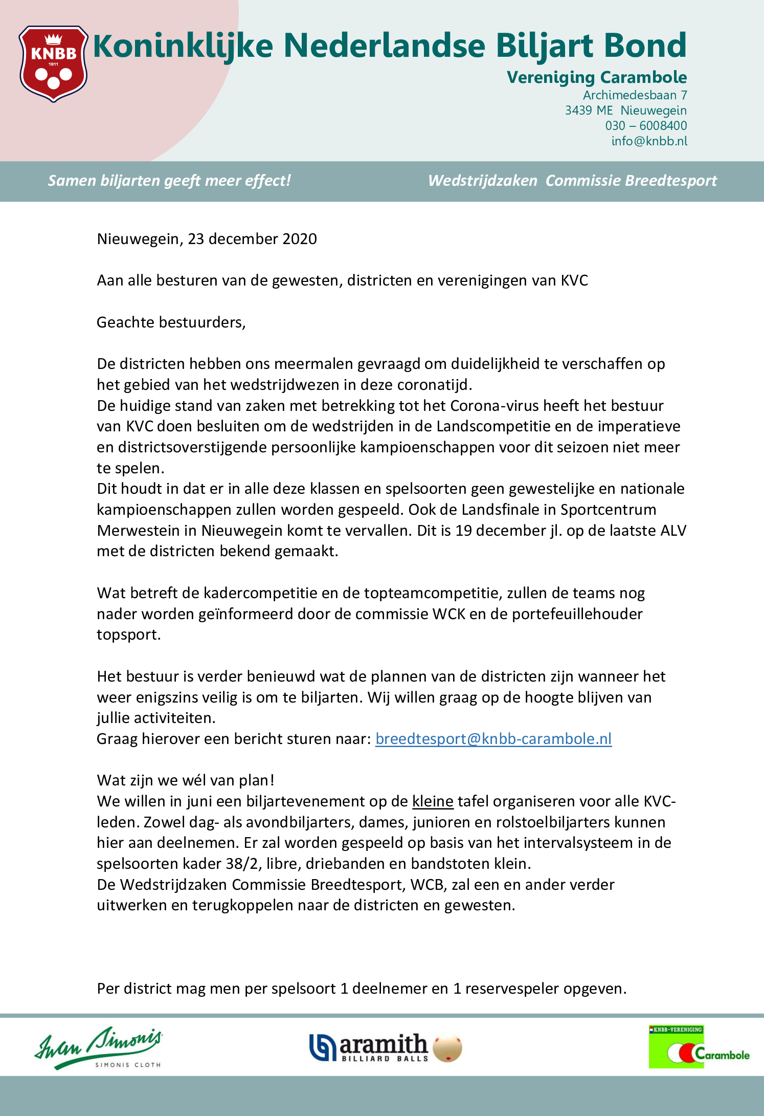 De KNBB heeft besloten dat dit seizoen, vanwege Corona, de competities en pk's niet meer worden hervat en dat er geen gewestelijke en nationale kampioenschappen meer gespeeld gaan worden. Ook gaat de Landsfinale in Nieuwegein niet door. Het is aan de districten zelf om te bepalen of men in de plaats van de competitie, nog iets anders wil gaan organiseren.