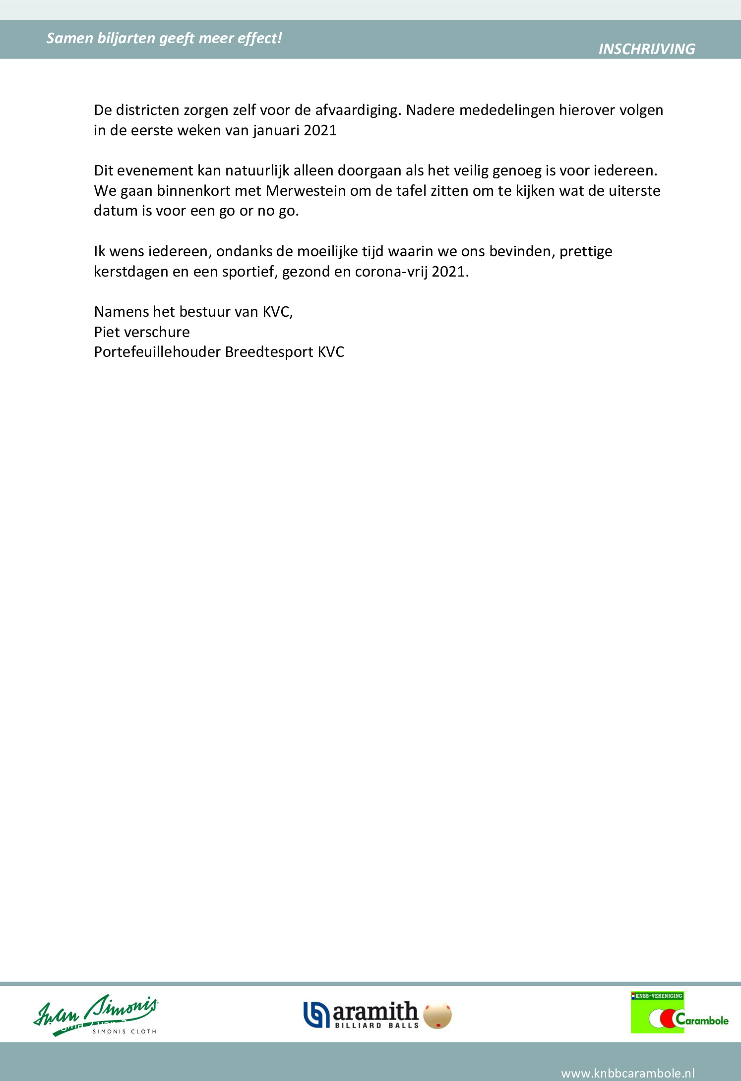 De KNBB is wel van plan in juni een biljartevenement op de kleine tafel te organiseren, maar dit moet nog nader worden uitgewerkt. In de eerste weken van januari volgt hierover meer informatie.