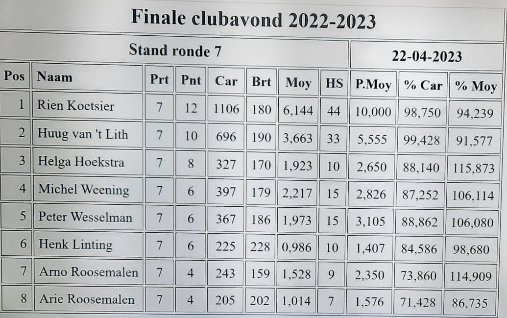 Op donderdagavond 20, vrijdagavond 21 en zaterdag 22 april 2023 is de finale gespeeld van de donderdagavond-clubcompetitie.